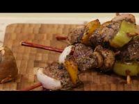 4.放入穿好的肉串,加入盐和黑胡椒,等肉煎到金黄成熟即可出锅