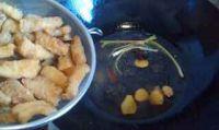 3.3.鱼肉包裹上一层生粉下锅炸至金黄坚挺后,捞出控油备用。
