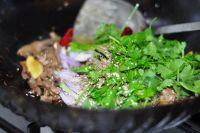 7.起锅热油,下入猪心煸炒,加入自制辣椒油,盐,孜然芝麻,洋葱,红椒快速炒香,加香菜出锅。
