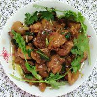 8.焖煮15分钟后鸡肉已经比较松软了,因为是嫩鸡,不需要焖煮太久。这时候撒入葱花,香菜,可以试下要是味道不够加入少许食盐一起翻炒一下就可以出锅了。
