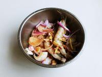 4.处理好的虾放入盆中,洋葱切丝,蒜切片放入盆中,调入盐、生抽、甜面酱、蚝油拌匀,腌制20分钟,充分入味。