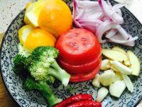 3.将番茄切成3片的厚片。洋葱切成丝。蒜瓣状。姜片状。辣椒切去尾部。橙皮洗净 西兰花洗净