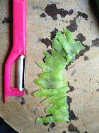 3.利用刮皮刀片出苦瓜片,这样片出来的苦瓜片很薄,厚度相同,冰镇后口感更好。